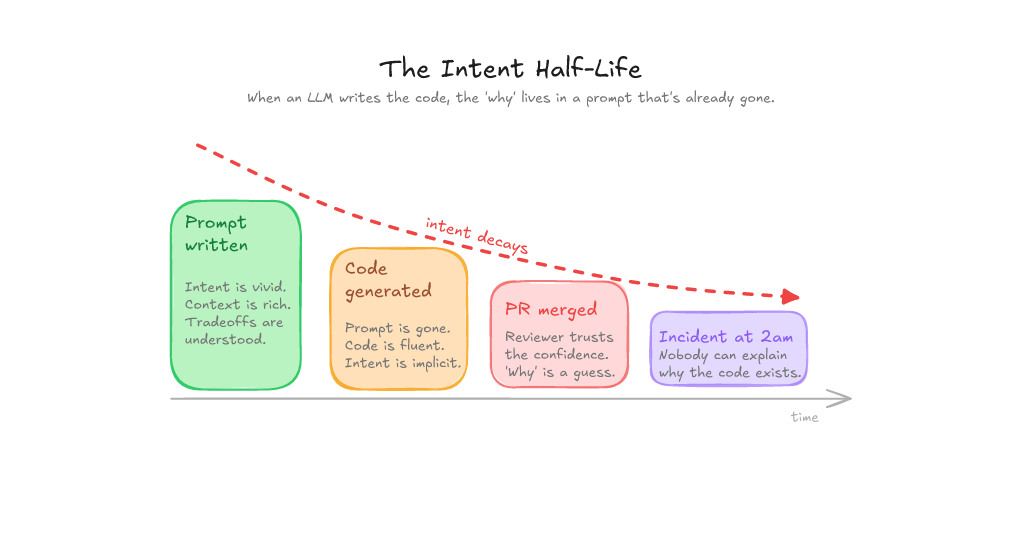 When an LLM generates code, the “why” was in the prompt. The prompt is gone. You’re left with clean, plausible code and nobody wrote down why it exists. Six weeks later, during an incident at 4am, you’re staring at a service that does something and nobody can explain the reasoning behind it.