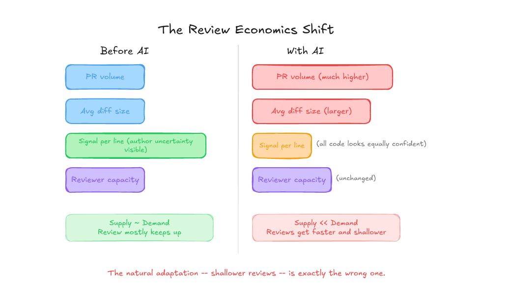 More PRs. Bigger diffs. Less signal per line. Same number of reviewers. That’s not a discipline problem. That’s a structural mismatch. And the natural response (faster, shallower reviews) is exactly the wrong adaptation, because the changes that most need deep review are now harder to distinguish from the ones that don’t.